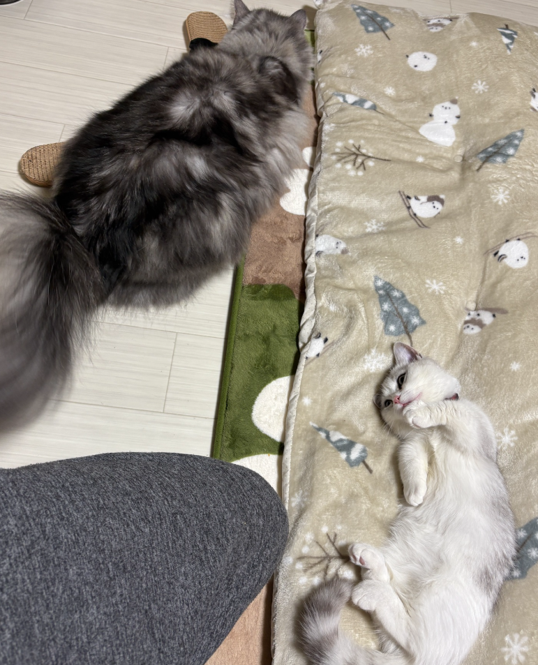 こたつの中に入ることはあまりしないのですが、こたつの上、こたつの周りの掛布団の上によく寝転がっています。こたつの上は、こたつの熱が伝わって暖かいためか、必ず1匹は寝転がっています。