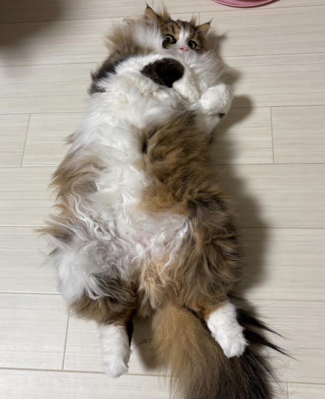 部屋が暑すぎたのかな?と心配をしつつ、暑さ、寒さ関係なくリラックスするときはいつもこのポーズです。我が家の名物「落ちてる毛玉」。