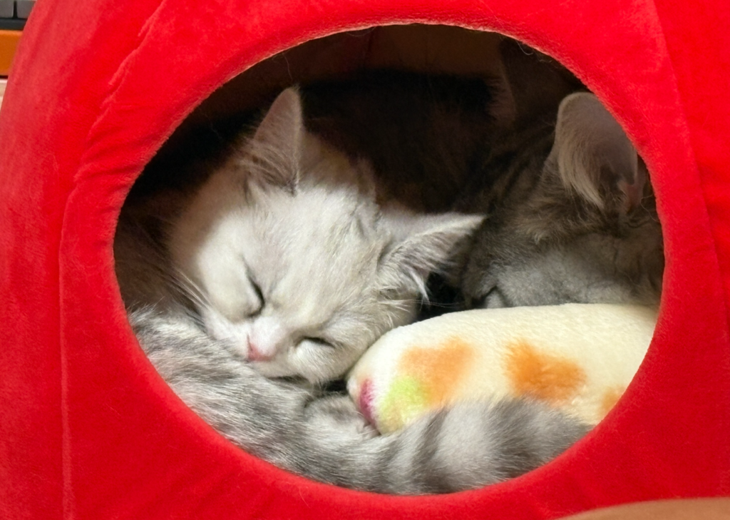 <せまいリンゴハウスで一緒に寝るルークとルーナ>