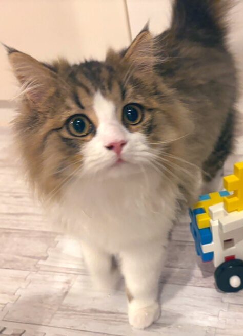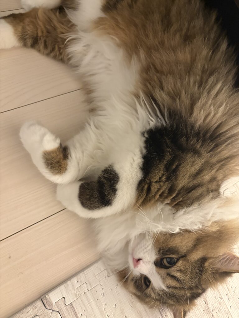 また、遊び好きの一面もあります。猫じゃらし・キャットタワー・レーザーポインターなどにはよく反応します。段ボールも好きです。Amazonの箱を置いておくと気づけば誰かが入っています。